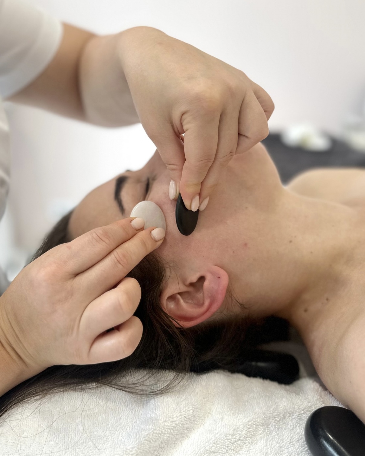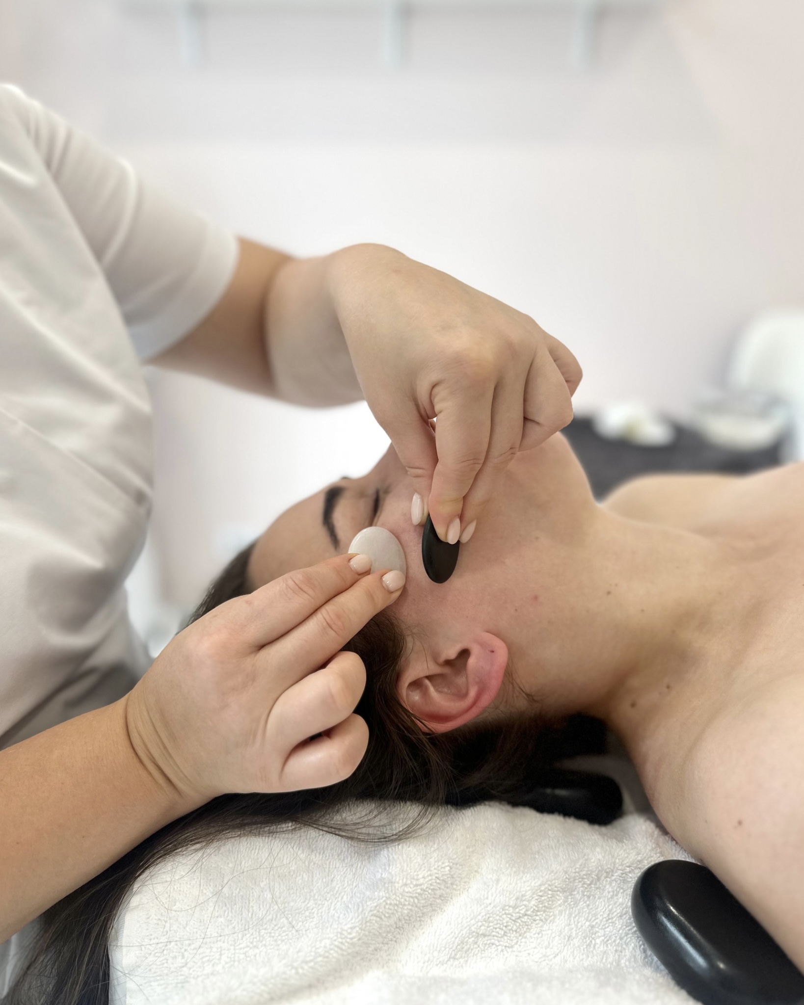 Стоунтерапія для обличчя — це делікатна техніка, яка використовує менші, спеціально підібрані камені для стимуляції шкіри, м’язів і енергетичних точок обличчя.